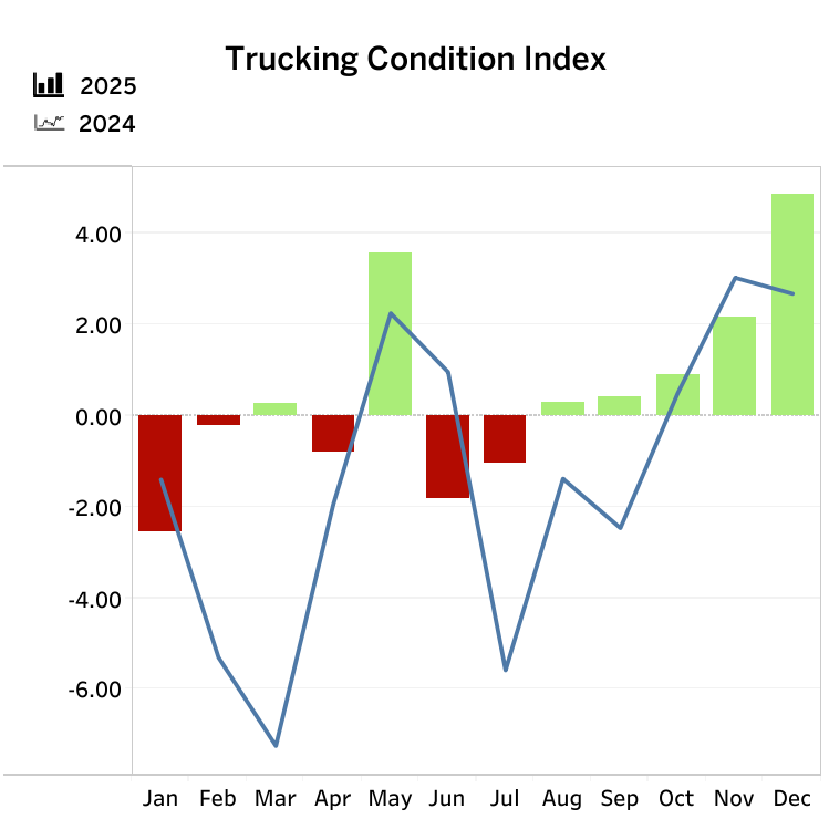 “First, the economy continues to exceed expectations, growing 4.4% quarter over quarter in Q3 2025. The Atlanta Fed’s GDPNow expects 4.2% growth in Q4,” said Ken Vieth, ACT’s president and senior analyst. “AI- and wealth-driven economic growth helped to absorb overcapacity into the end of 2025, and the economy appears to have good momentum into early 2026. Looking forward, the high likelihood the Supreme Court strikes down IEEPA tariffs as unconstitutional may lead to an inventory restock, further bolstering for-hire volumes.”