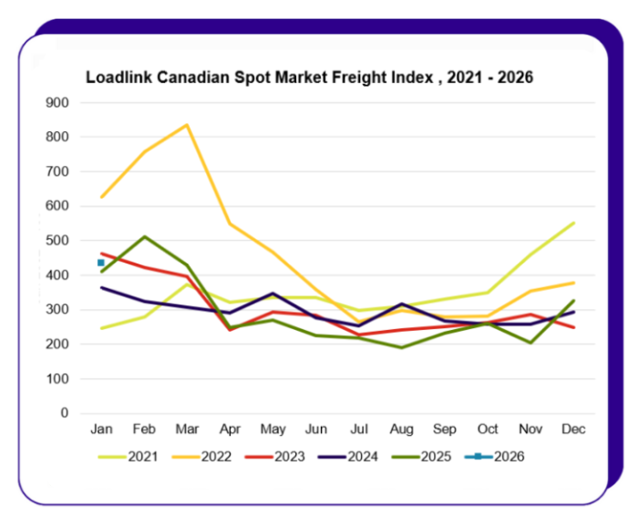 “January’s momentum didn’t reset after the holidays; it built on December’s,” said James Reyes, general manager at Loadlink. “Inbound freight into Canada sets the pace, and when capacity tightens, the market moves faster, and teams have to move with more intent. Carriers gain more control over what fits their network, and brokers who commit earlier on priority lanes stay ahead of the curve.”