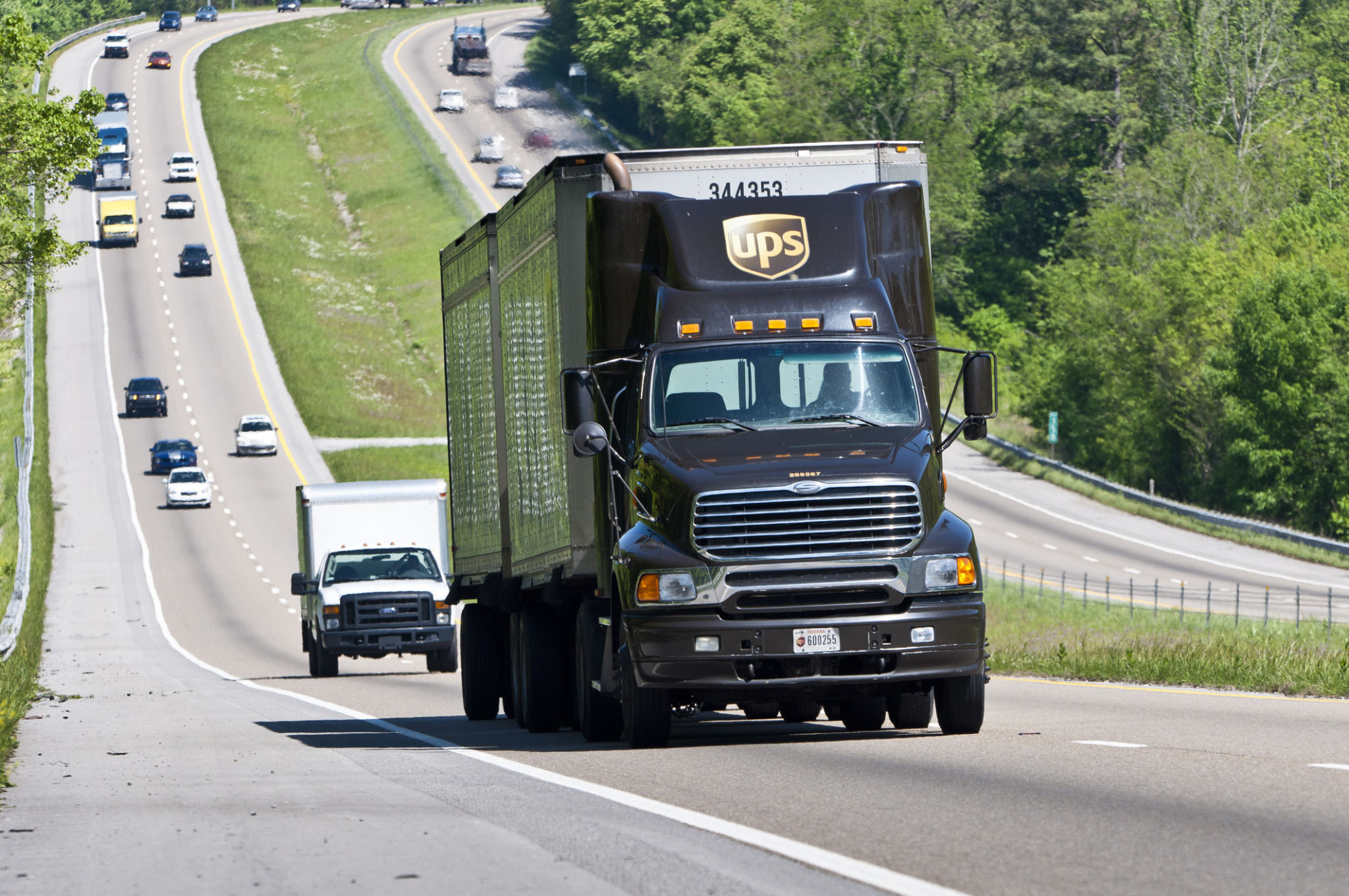Double-Trailer UPS Semi Rig Climbs Hill On Interstate