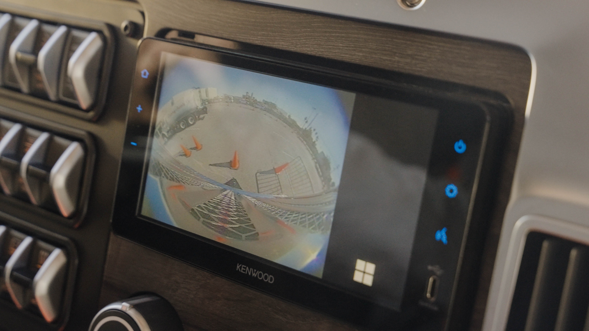 The system is automatically triggered by key vehicle inputs, including left and right turn signals and reverse gear, with live video displayed on the in-cab touchscreen. A forward-facing camera, mounted in the grille, can be manually activated by the driver when additional visibility is desired.