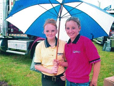 RAYS OF SUNSHINE: Charlotte Hallman (11) and Ashley Maher (12) of Plattsville, Ont. kept a close eye on Dale Hallman's Western Star 4900 FA, despite the rain.Photo by Ingrid Phaneuf