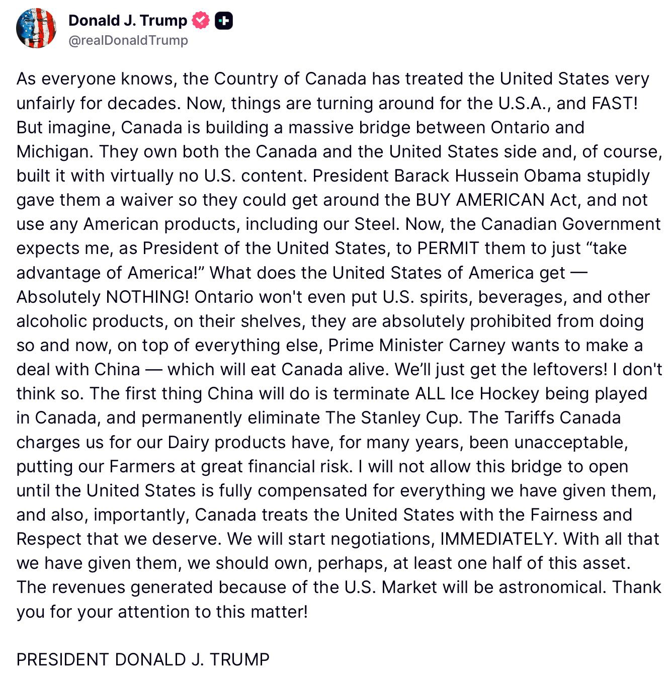 In his post, Trump said Canada has treated the United States “very unfairly” for decades.