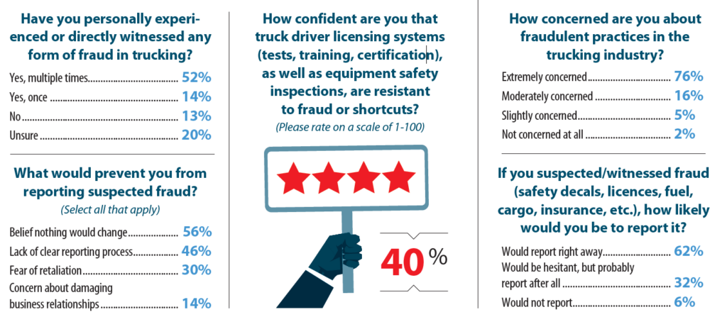 And the Pulse Reader Survey results align with that interest. Eighty-four percent of respondents highlighted fraudulent or improperly obtained licences as the biggest problem facing the industry right now. Fraudulent safety inspections and fake safety decals followed closely at 77%.