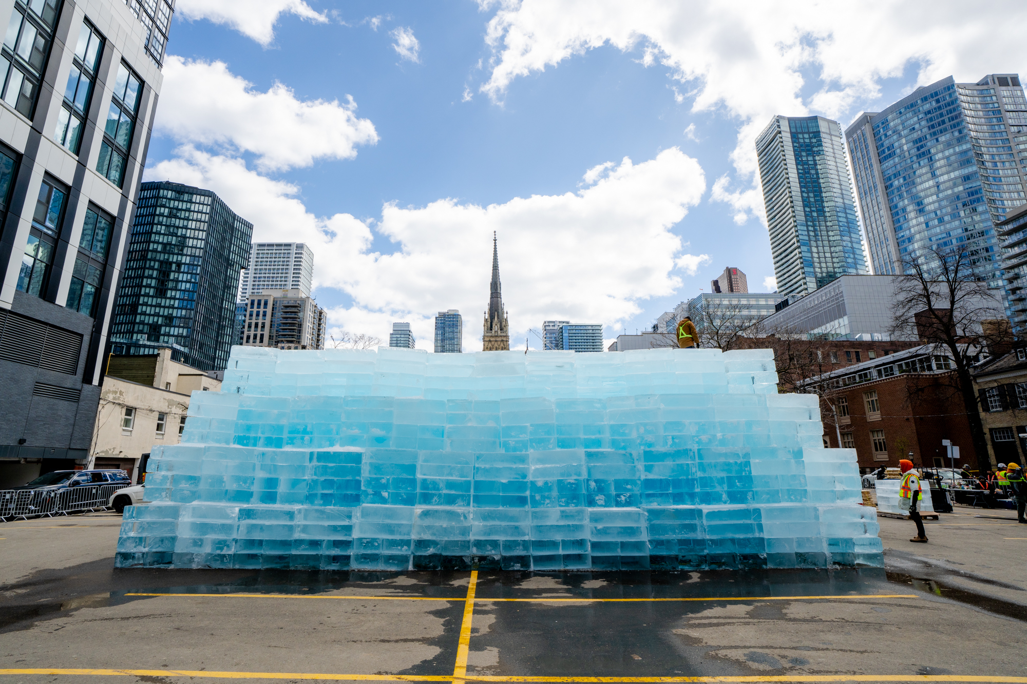 The ice blocks — weighing 285 lb. each — were assembled into a tower with the album’s release date hidden inside, drawing crowds to the installation in Toronto.