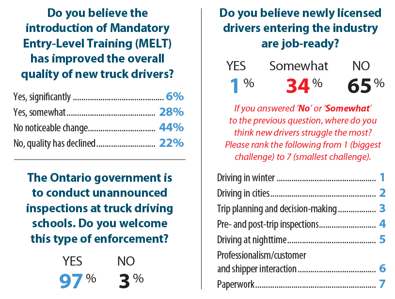 Mandatory entry-level training (MELT) was designed to raise the bar for Canada’s truck drivers. But eight years later, our readers say the bar may still not be high enough — with most reporting no noticeable improvement in driver quality and fewer than 40% believing new drivers are ready for the job.