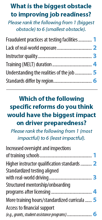 Fraudulent practices at testing facilities and a lack of real-world exposure ranked as the top obstacle to improving job readiness. Just in September 2025, trucknews.com reported on the Ontario Ministry of Transportation suspending truckers’ licences due to uncovered dishonesty during the Class A testing and/or training processes.