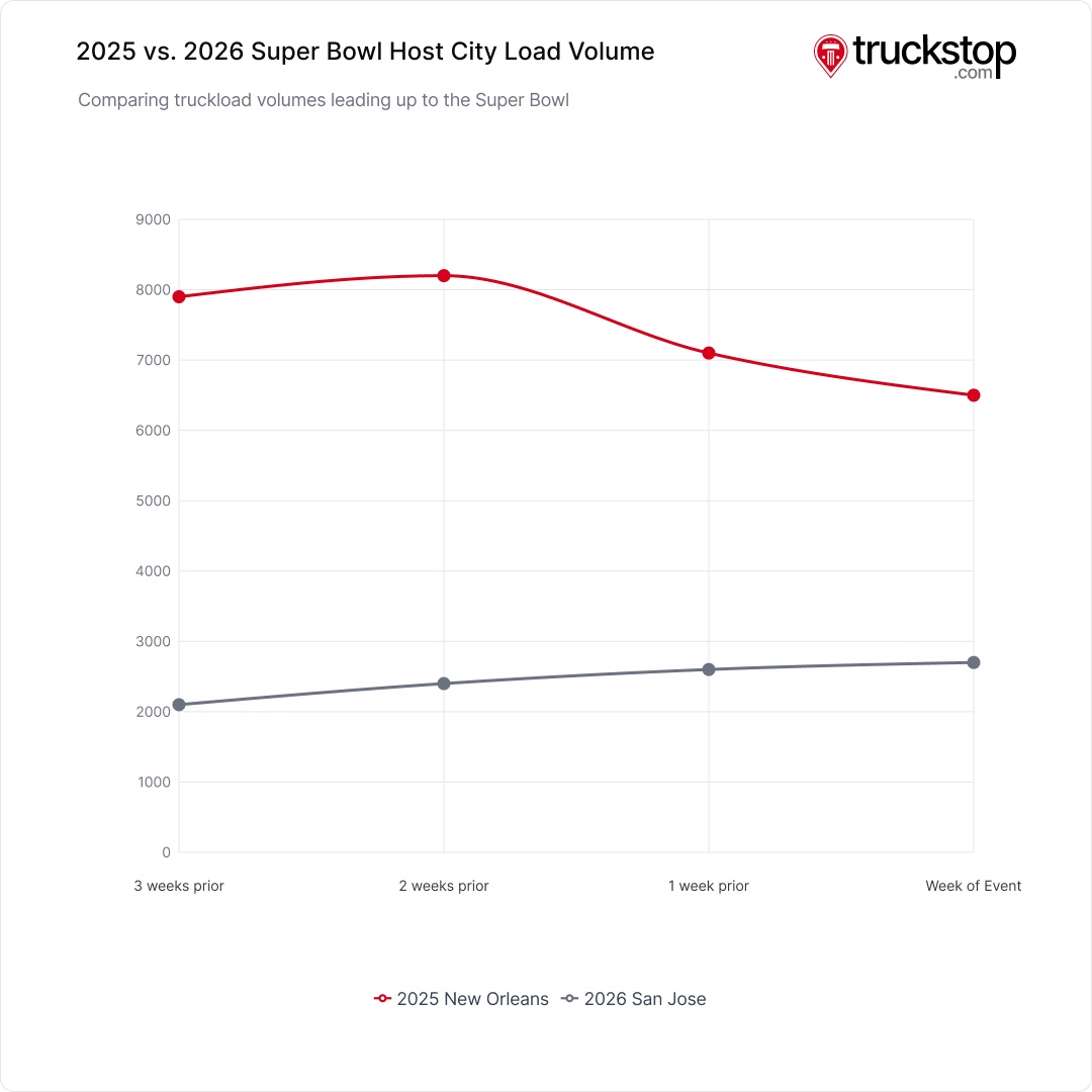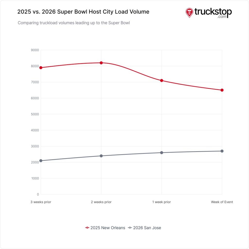 The upcoming Super Bowl LX game between the New England Patriots and the Seattle Seahawks at Levi’s Stadium in Santa Clara is creating a spike in freight activity into Northern California, with load volumes and some spot rates rising in the days leading up to the game.